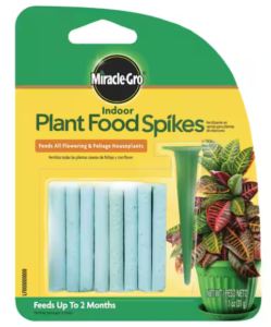 Miracle Gro Indoor Plant Food Spikes deliver a slow supply of nitrogen, phosphorus, and potassium. They work for low-maintenance feedings of pothos, snake plants, ZZ plants, dracaena, and similar houseplants.